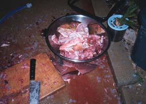 玄関前の水道端で大きなマナ板を地ベタにセッティングして