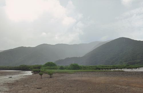 河口の干潟へ立ち入ってじきに、雨が近づいてきてしまう。