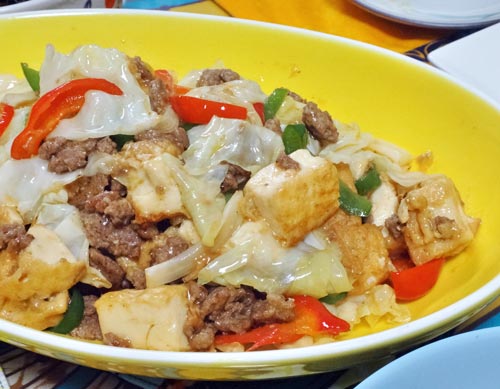 そろそろ限界の絹厚揚げとキャベツに、冷凍のミンチを組合せた。