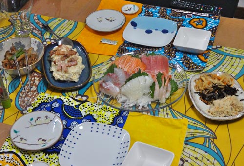 刺身盛り合わせ、煮物、居酒屋風ポテサラなどをそろえて、乾杯ね。