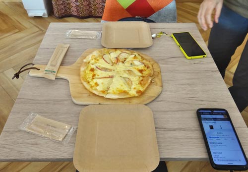 はちみつとオイルがたっぷりかかった、リンゴとチーズのピザ・・