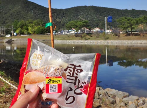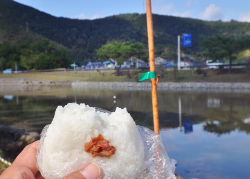 持参したおむすびと、ドラッグストアで求めたオカズをいただく。