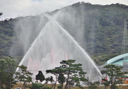 龍郷町の出初式が始まったらしく、華々しい紅白の放水!